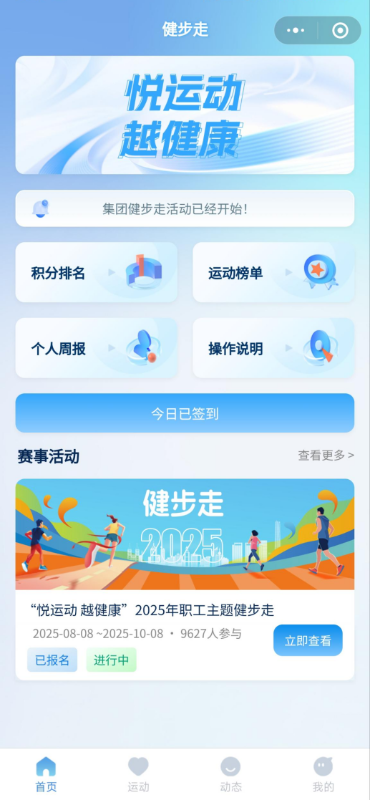 該小程序為響應三峽集團工會“悅運動越健康”主題健步走活動研發,聚焦職工實際需求,融合前沿技術,實現“功能全、操作簡”。無需額外下載APP,進入微信小程序完成報名后,依托微信運動功能就能實時獲取當日運動步數。小程序可精準記錄每日運動數據,自動生成周報與月報,職工可清晰掌握運動軌跡。同時根據累積步數規則推送健步走知識問答,引導職工科學健身。職工完成活動任務還能獲得積分獎勵,大大增強職工健身成就感,提高參與積極性。小程序通過數字化手段為集團廣大職工帶來全新的健步走體驗,不僅助力集團公司積極踐行國家全民健身戰略,更在推動職工養成文明健康生活方式、提升身體素質等方面發揮著重要作用。